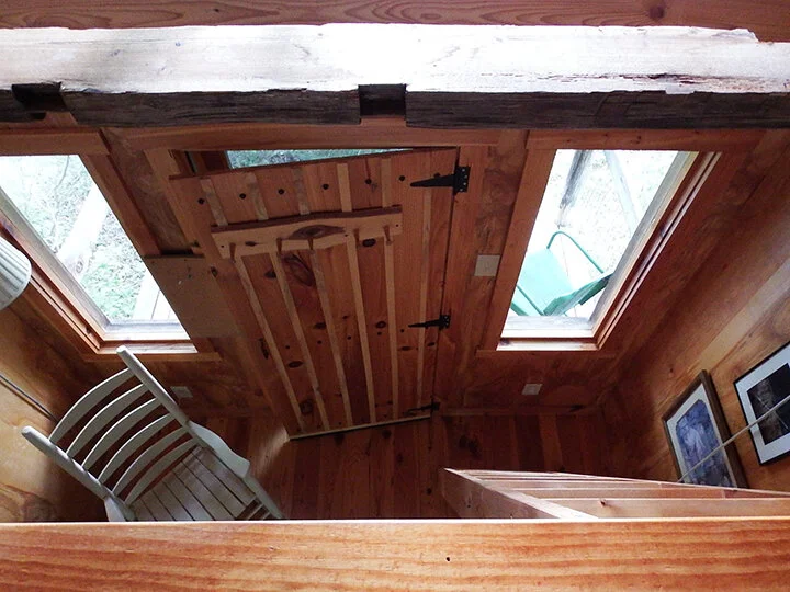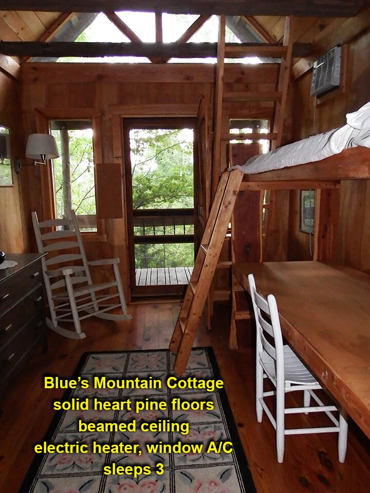 The darling little Blue’s Mountain Cottage was originally built for Breakaway leaders and chaperones to relax apart from the students. It is a simple cabin with no running water and sleeps three with a bunk bed on the main level and a twin mattress in the loft. The back porch overlooks the garden and has a wonderful view of the mountains.