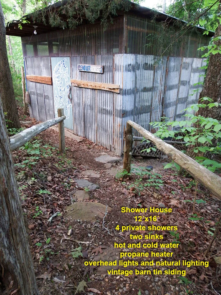 The Shower House has four ample easy-to-clean private fiberglass shower units and two utility sinks. Clear panels at the top of the exterior walls provide natural light. There’s hot and cold running water, overhead lighting, ample hanging pegs inside and out, cotton rugs, and convenient access from all of the cabins.